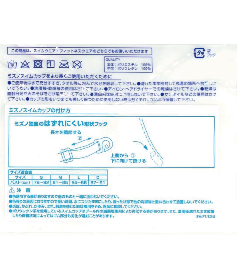 競泳水着はフックを引っかける部分が無い為、縫い付けになります。